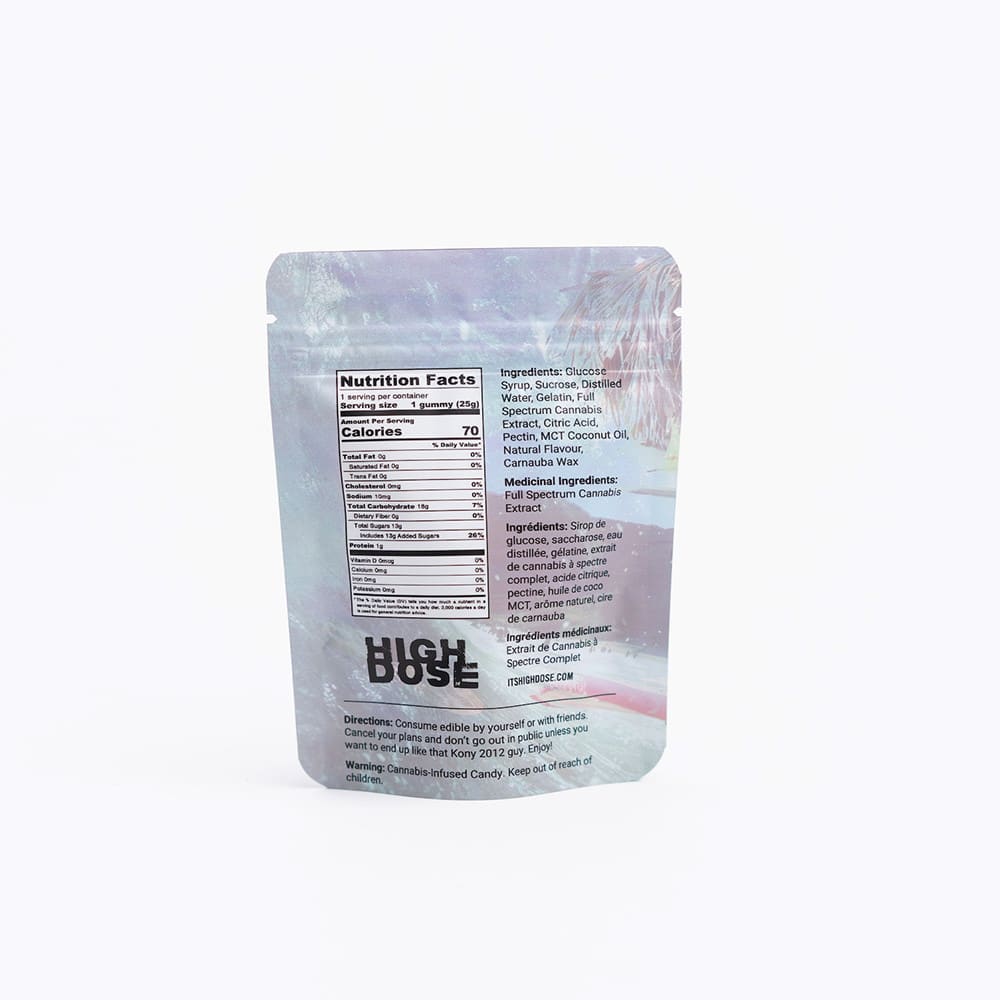 High Dose THC Gummies 1000Mg by High Dose are made with high quality THC distillate which is derived from high quality cannabis strains. Kick back and relax with some friends and enjoy these high dose edibles. High Dose Gummies are inspired by the west coast lifestyle, which includes chillin’ by the beach, surfing, skating and getting high with friends.